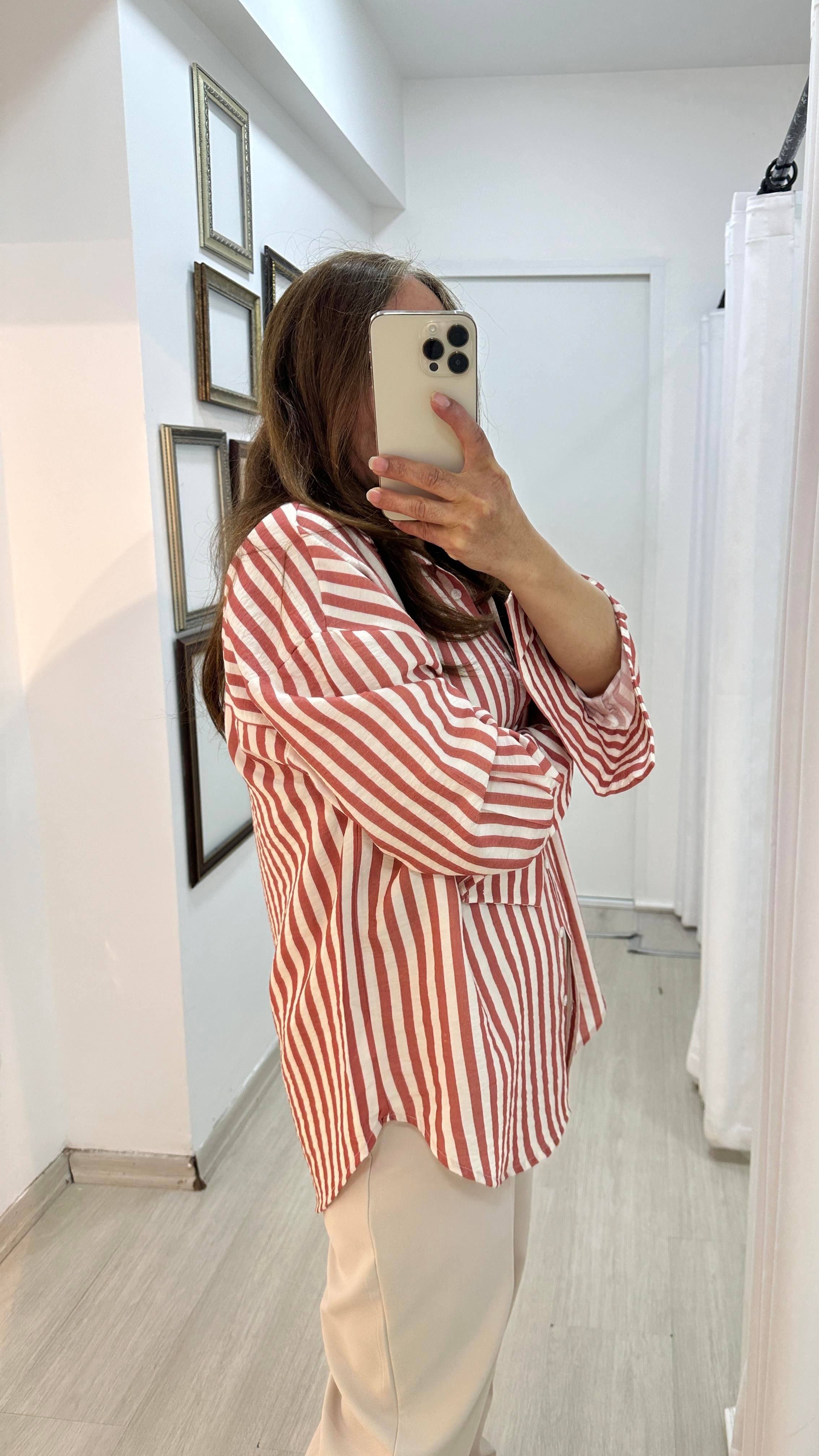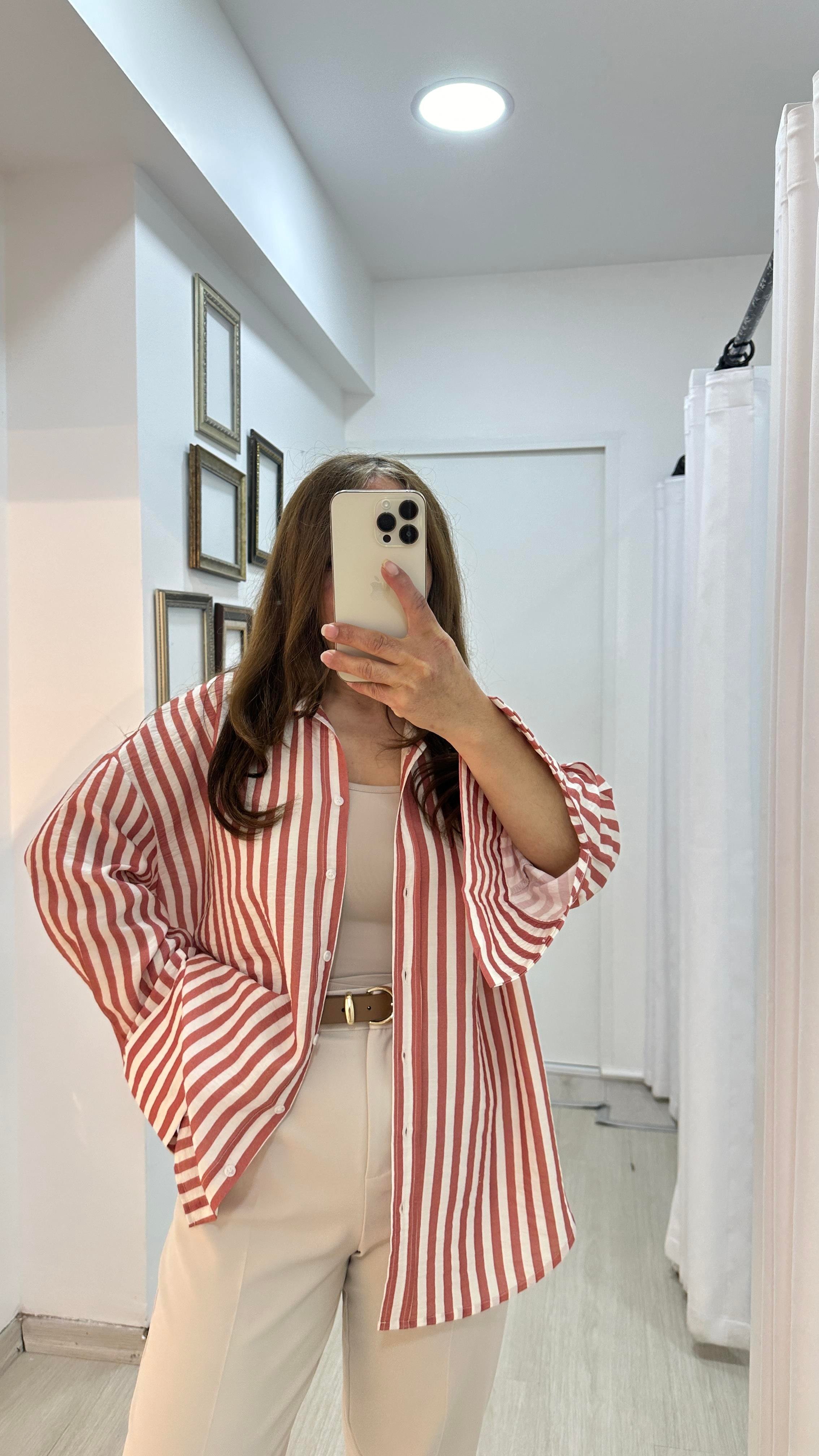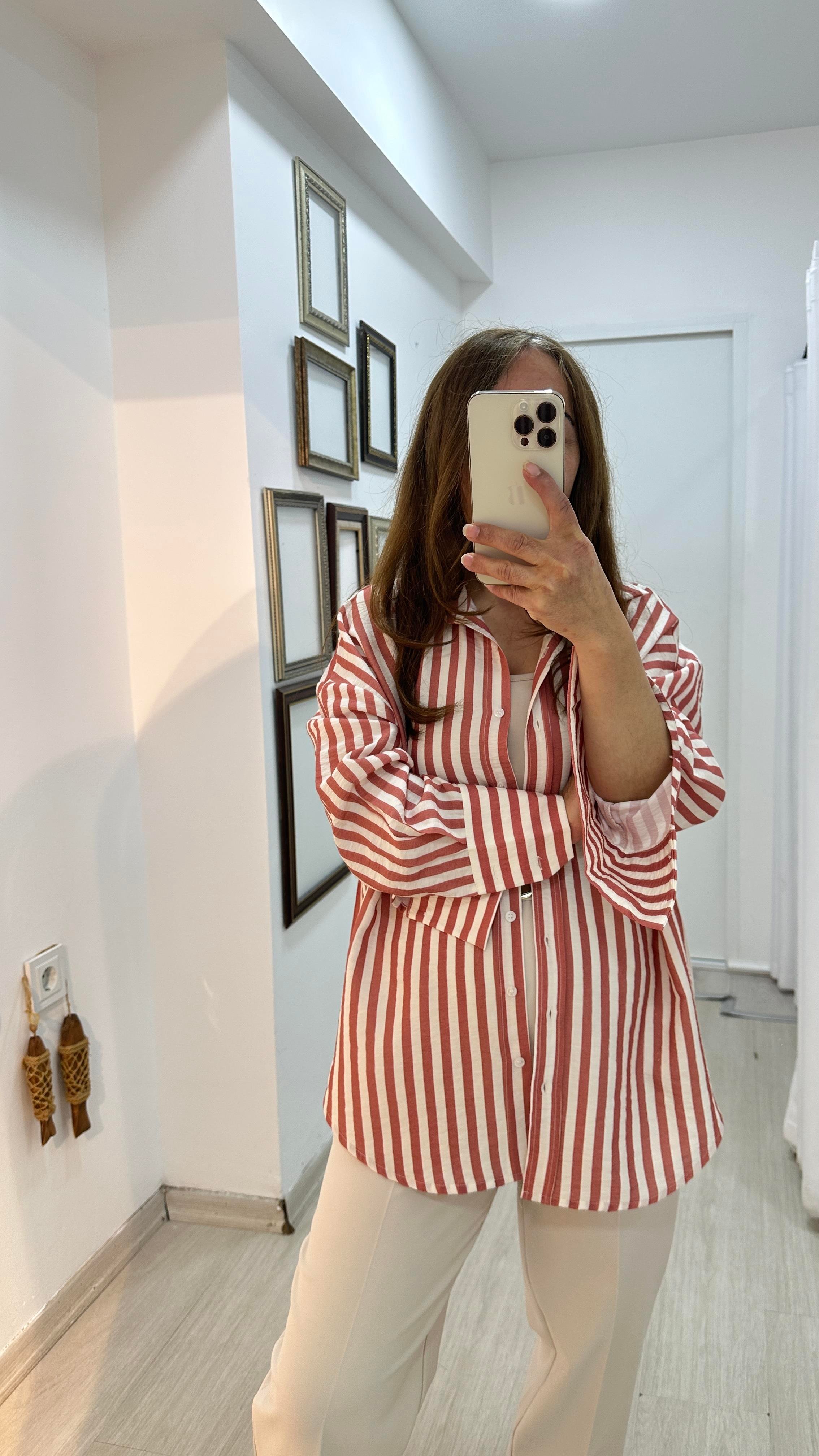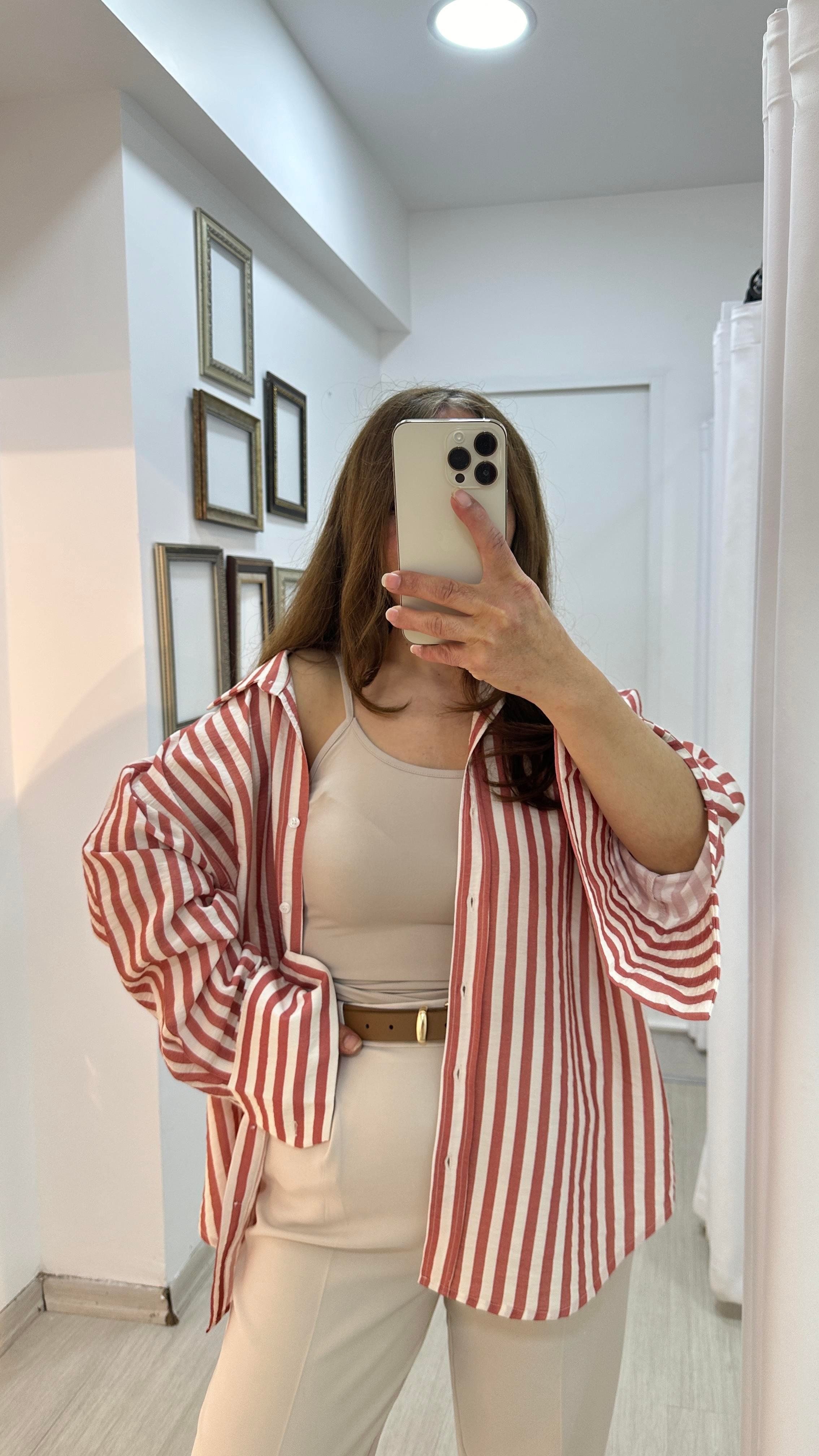 Bej Kiremit Çizgili Modal Viskon Gömlek (02-GK0011)