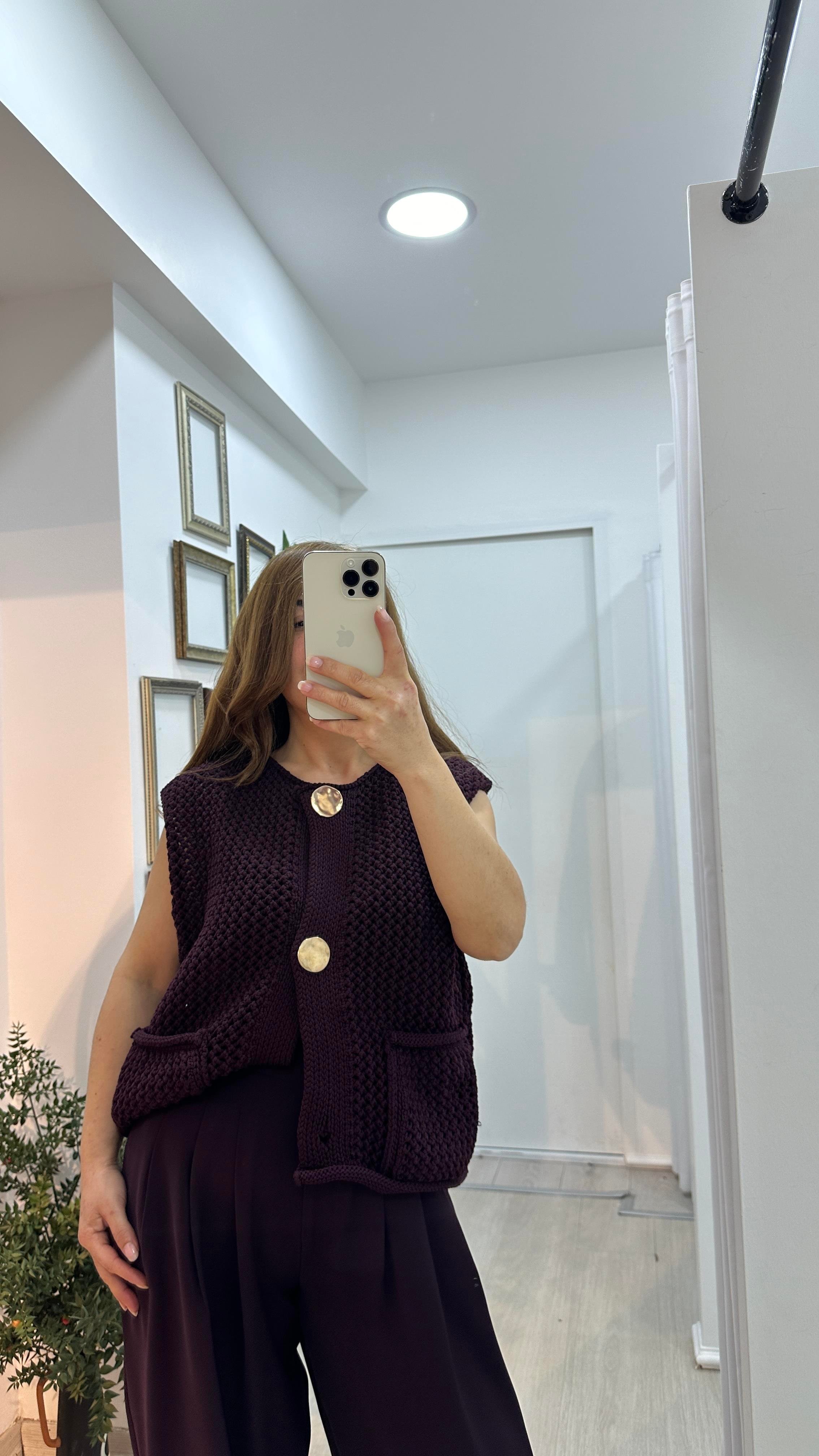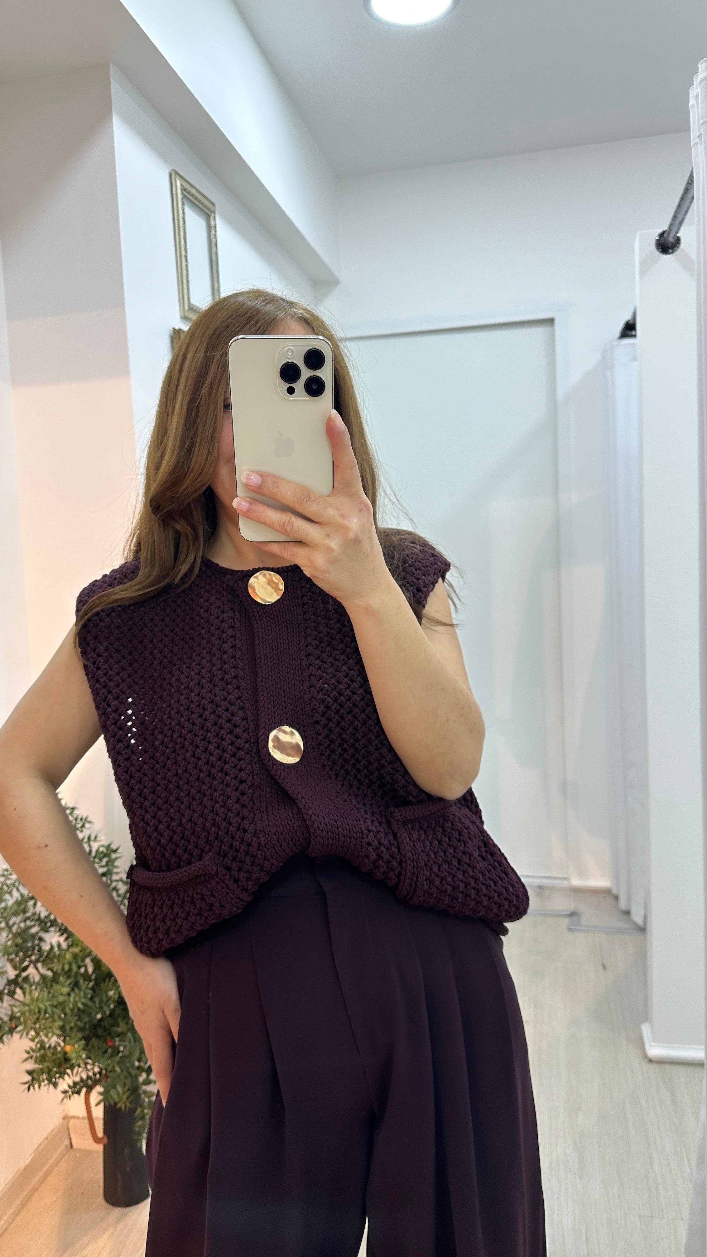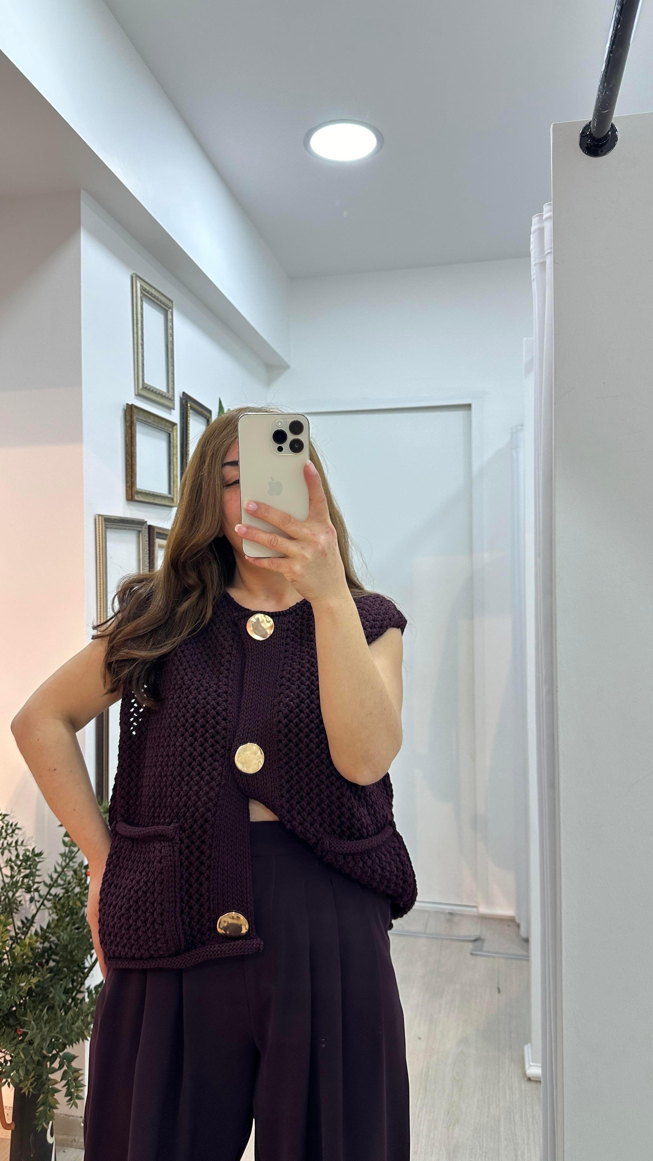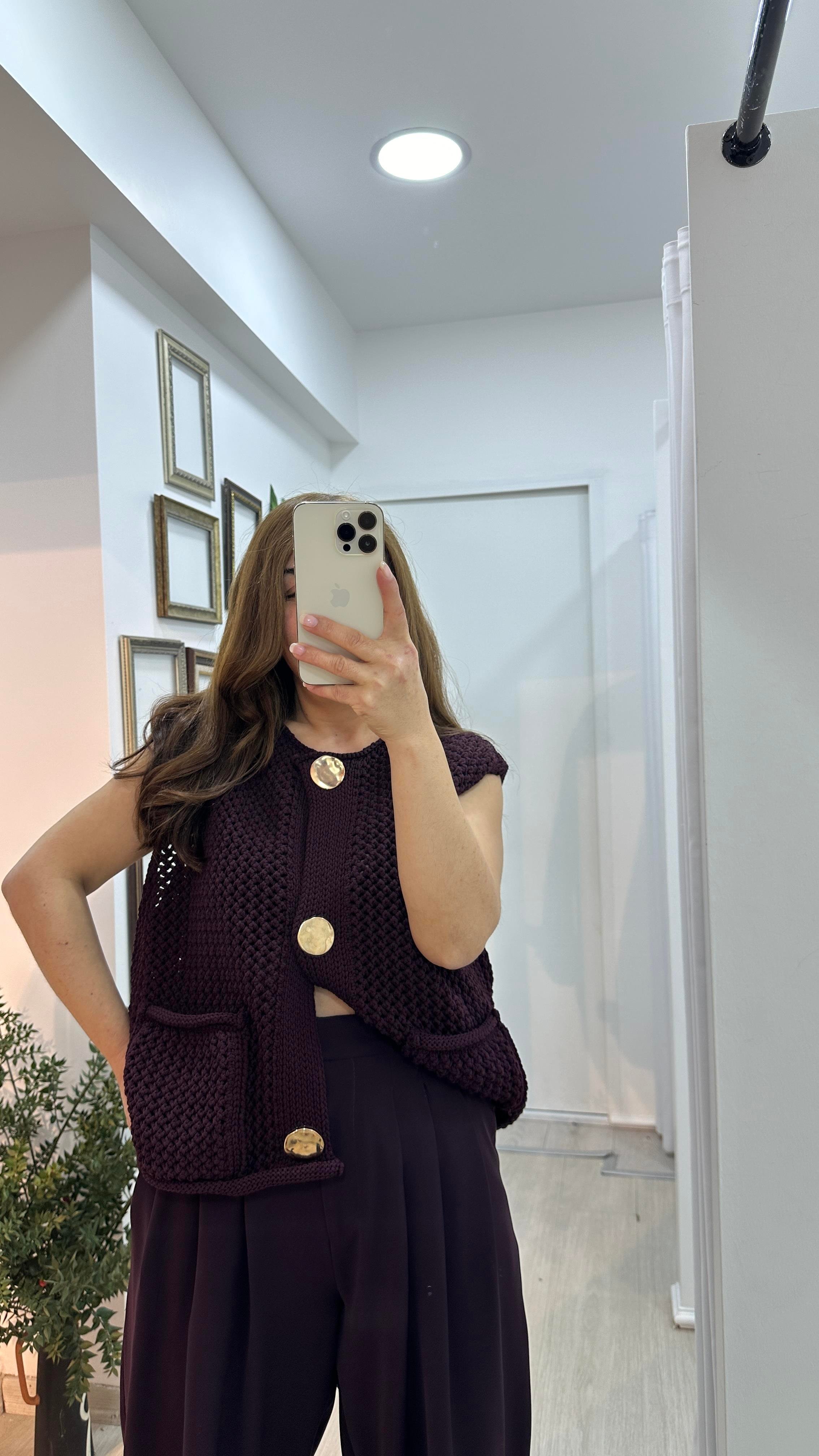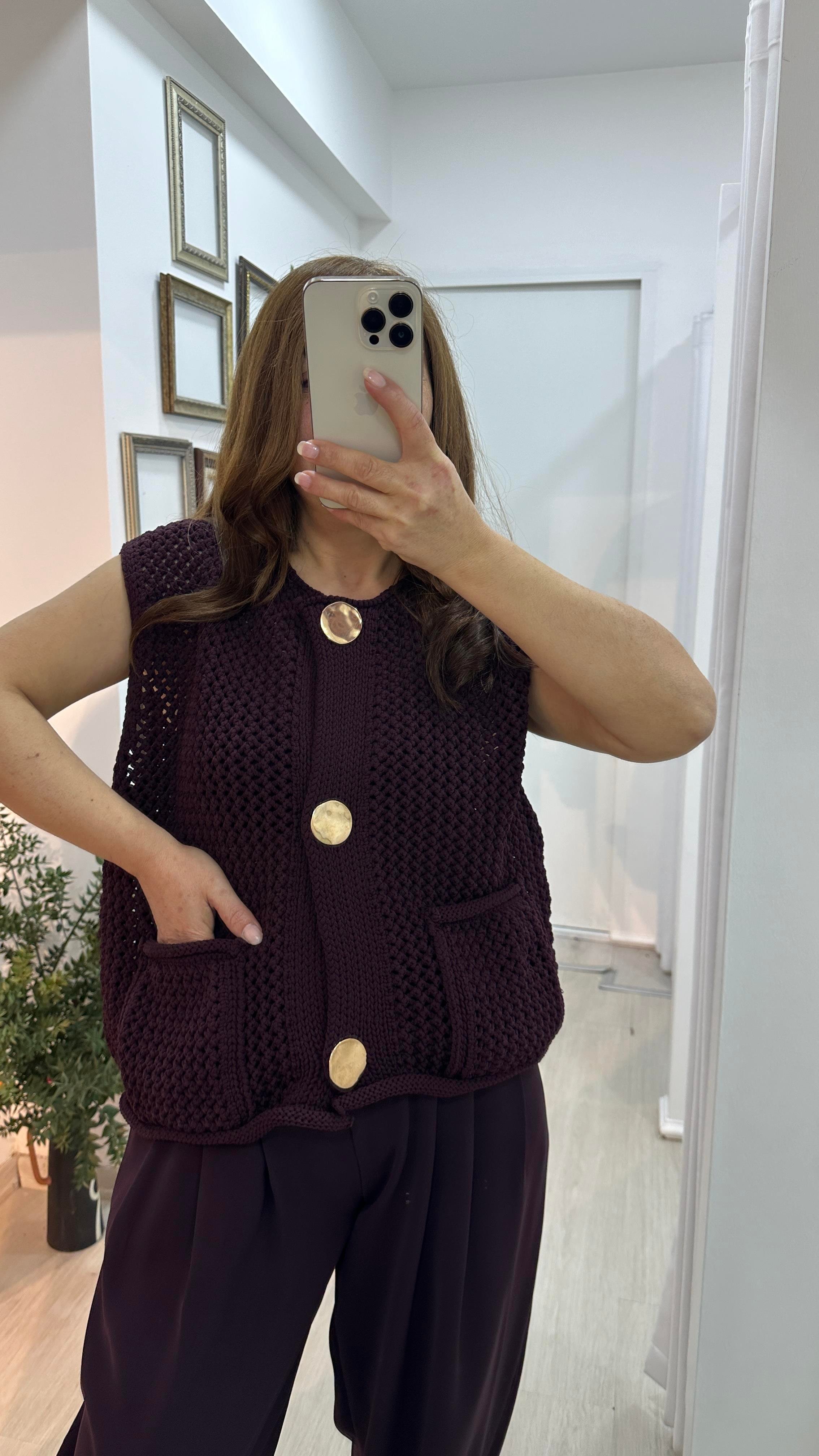 Gold Düğme Detaylı Örgü Yelek -bordo (03-YK0001)