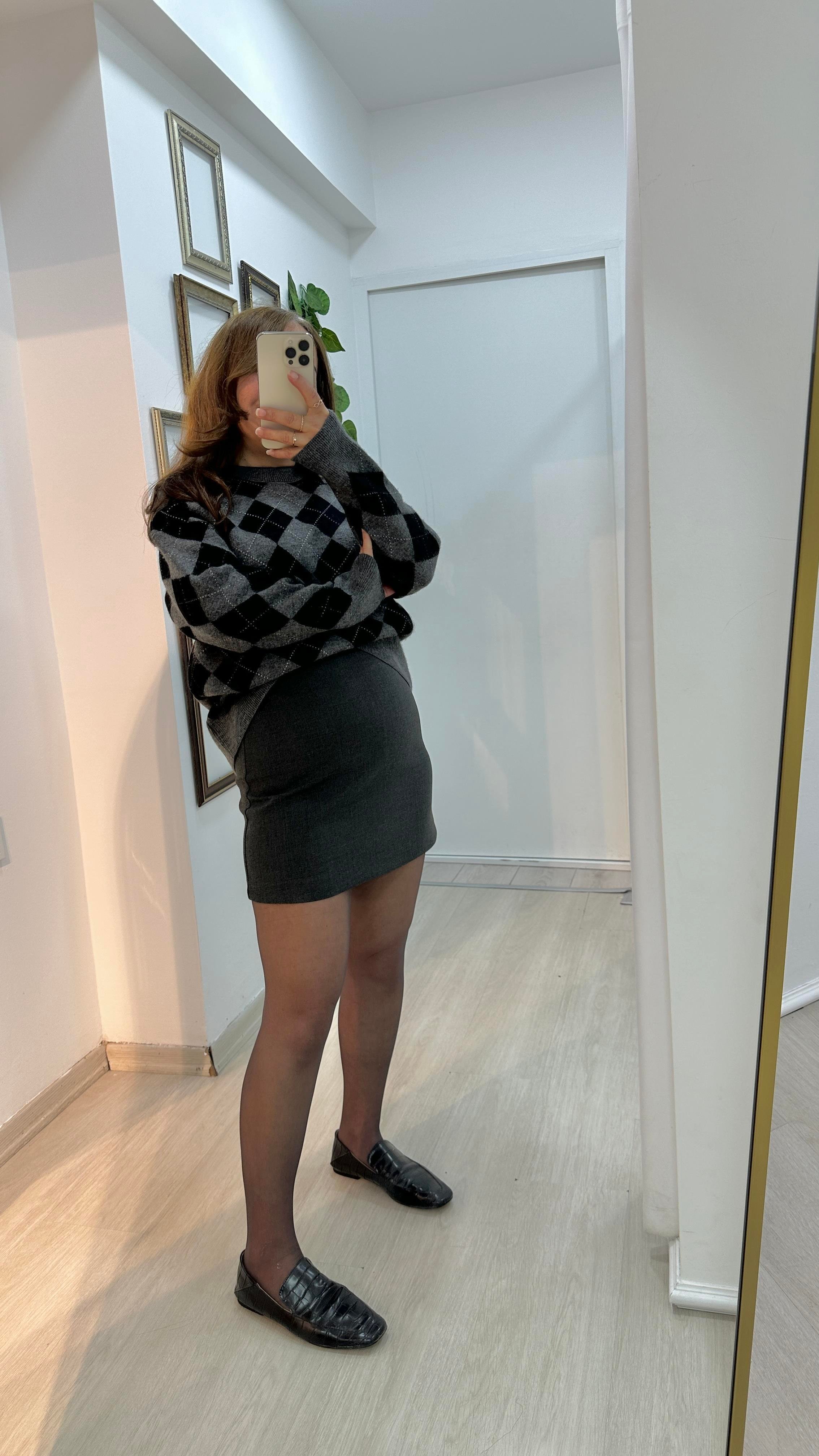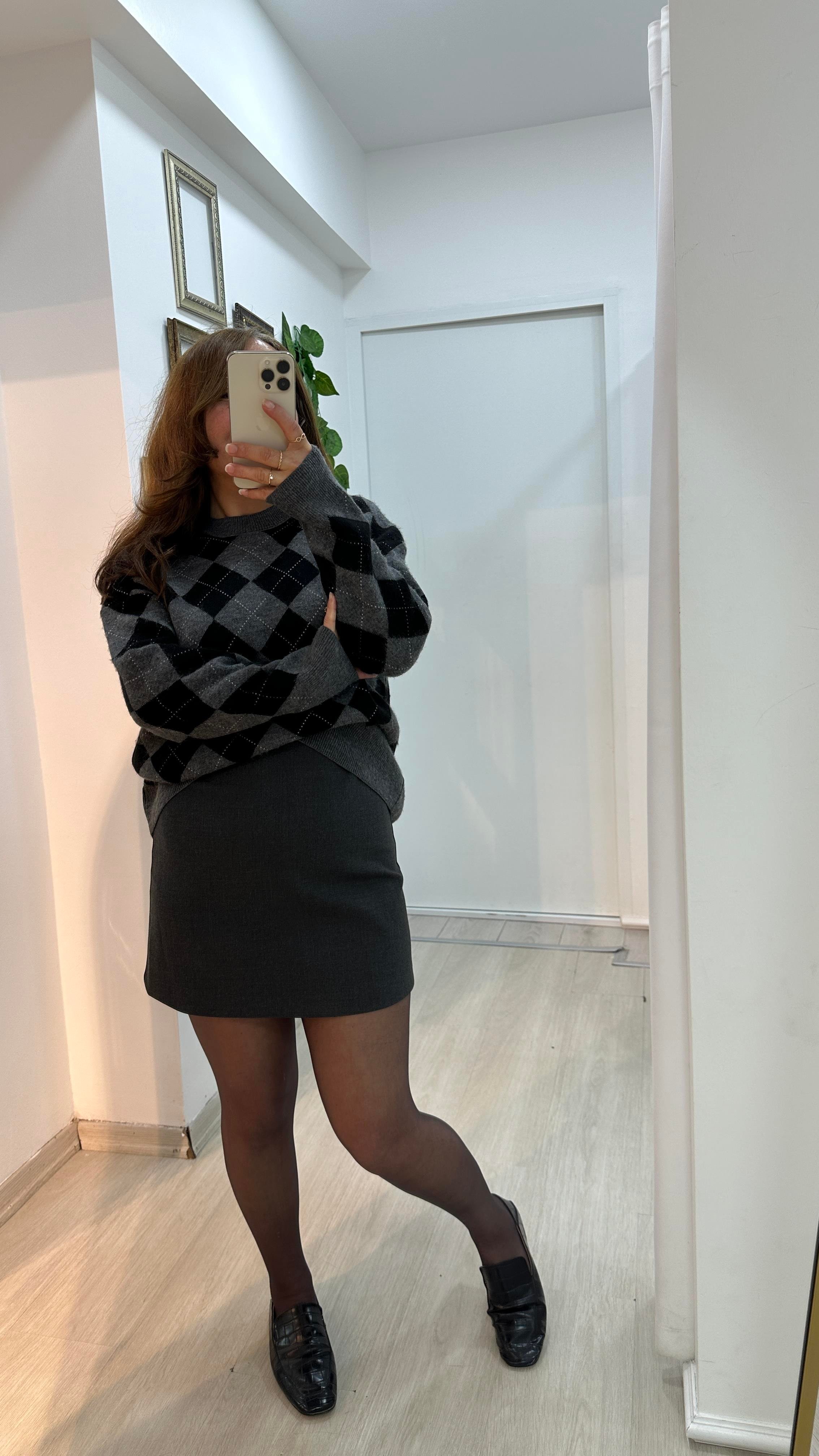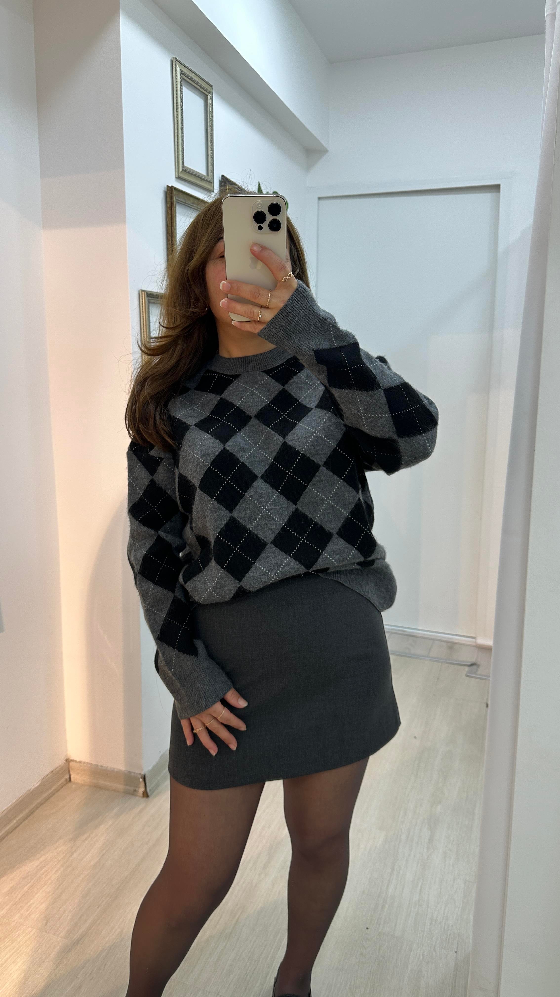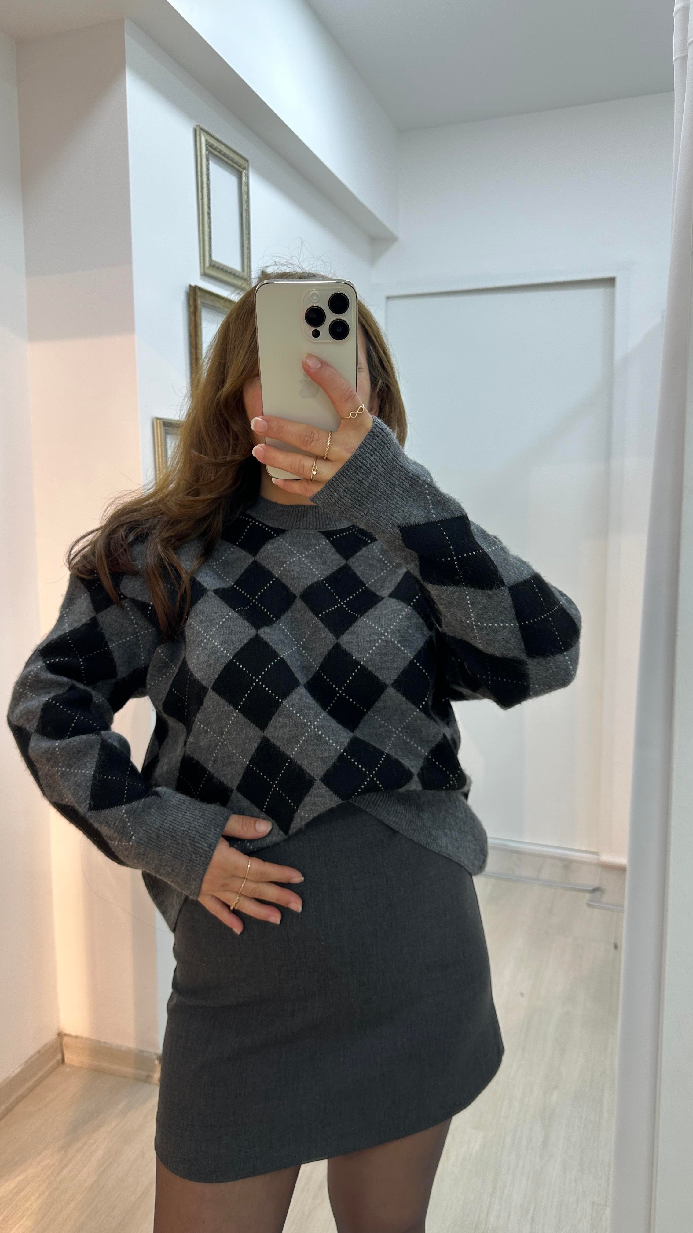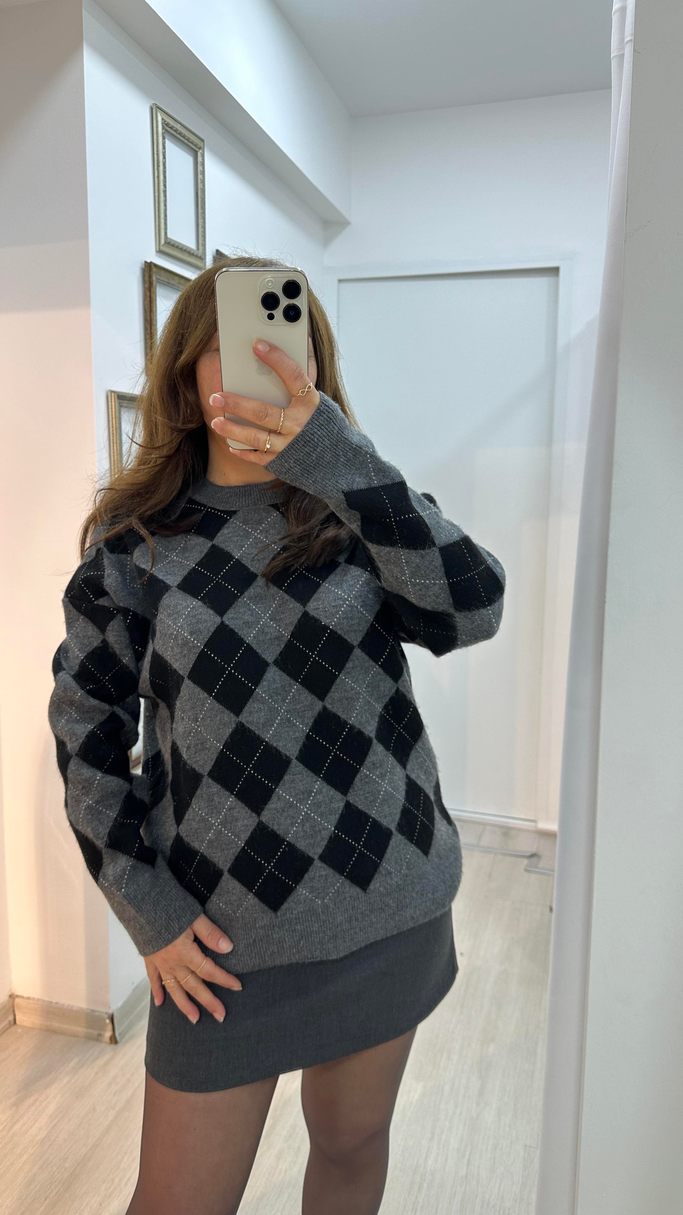 Siyah-Gri Baklava Desenli Uzun Şık Kazak (02-TK0013)